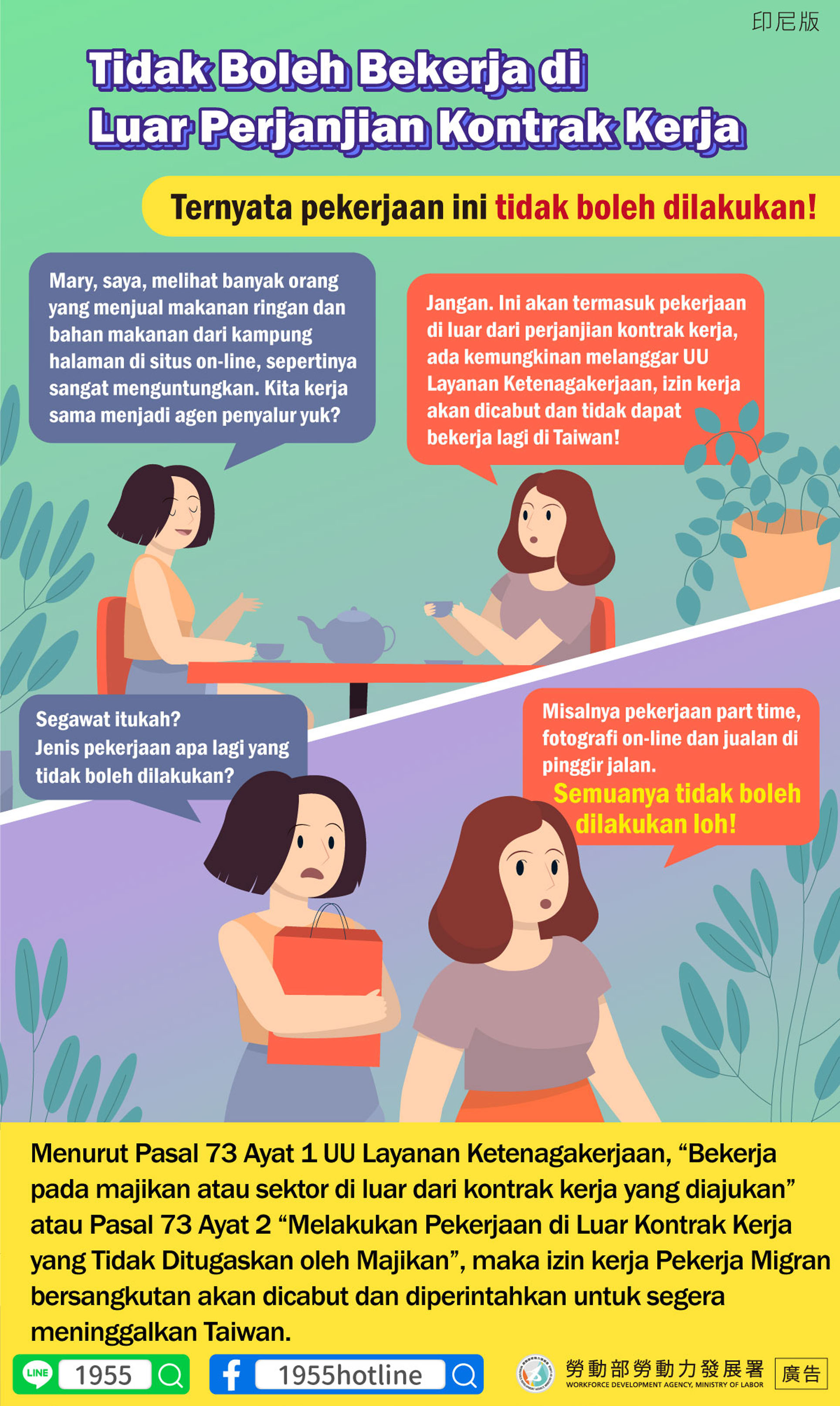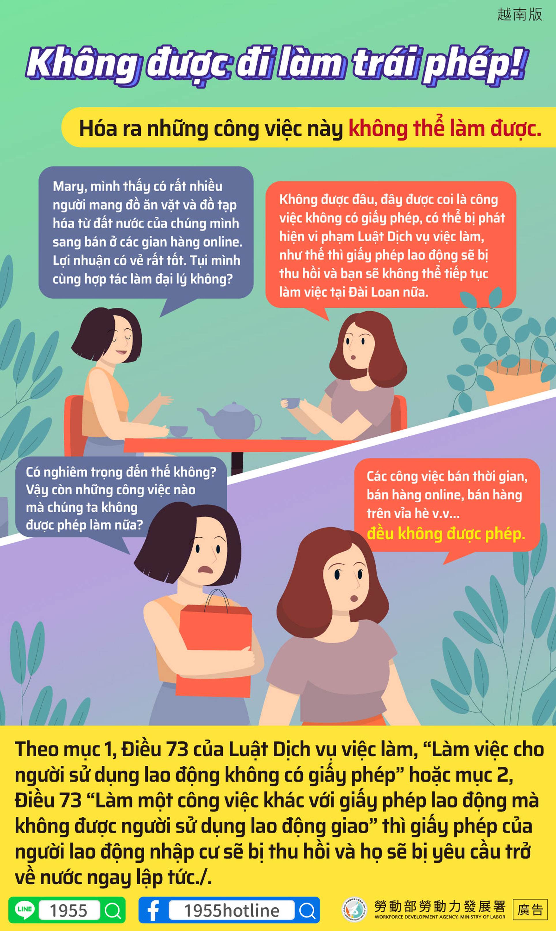 B:譬如打工、網拍或擺攤等等都是不能做的喔!